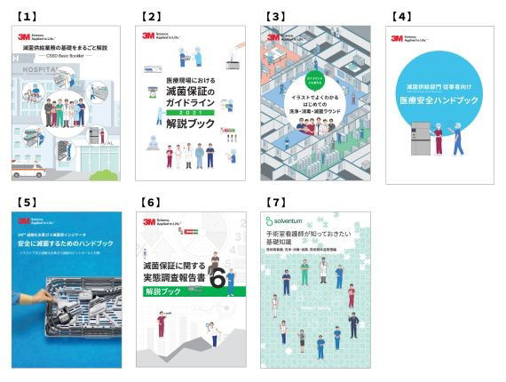 【1】滅菌供給業務の基礎をまるごと解説 -CSSD Basic Booklet- 滅菌供給部門(CSSD)従事者から現場責任者、管理者向け 滅菌供給業務の運用で欠かせない、基本的な項目(洗浄から滅菌包装、各種滅菌方法と管理)を網羅しています。 従事者の教育やOJTなどで活用できます。また、クイズ形式でもエビデンスを学ぶことができます。 【2】医療現場における滅菌保証のガイドライン2021解説ブック 滅菌技師/士、現場責任者、管理者向け 2021年10月に刊行された第5版では、品質マネジメントや製品ファミリー、リリース基準などが明文化されました。本冊子では、滅菌供給部門(CSSD)における品質マネジメントの考え方や製品ファミリーの具体的な例示、滅菌方法のバリデーションやリリース基準などについて解説しています。 ガイドラインの補助的なツールとしてご活用ください。 【3】イラストでよくわかる はじめての洗浄・消毒・滅菌ラウンド(CSSD Round Book) 管理者、現場責任者向け 滅菌供給部門(CSSD)で必要とされる標準作業手順書(SOP)や部門全体の運用を確認する冊子です。 各章にチェック項目がありますので、ICTラウンドなどでご活用ください。 本冊子は、滅菌保証ガイドラインの入り口としてもご活用いただけます。 【4】滅菌供給部門 従事者向け 医療安全ハンドブック 主に滅菌供給部門(CSSD)従事者及び現場責任者向け 滅菌供給部門(CSSD)従事者が知っておきたい医療安全の用語や再発防止策の考え方などをイラストを用いてわかりやすくまとめた冊子になっています。冊子の前半はCSSD従事者全員が知っておきたい用語、後半は現場責任者が知っておきたい情報収集のやり方、再発防止策の考え方などについて解説しています。 【5】3M™ 過酸化水素ガス滅菌用インジケータ 安全に滅菌するためのハンドブック -イラストで学ぶ過酸化水素ガス滅菌のピットホールと対策- 現場責任者向け、従事者向け 過酸化水素ガス滅菌は、低温で短時間で処理できる滅菌法であり、内視鏡手術などの再生処理には欠かせない滅菌法です。確実かつ安全に運用するためのポイントや注意点をまとめた冊子です。 【6】滅菌保証に関する実態調査報告書6解説ブック 滅菌技師/士、現場責任者、管理者向け 2023年8月の医療機器学に掲載された「滅菌保証に関する実態調査報告書6 」を解説した冊子です。イラストや図解付きでより分かりやすい構成になっています。 【7】手術室看護師が知っておきたい基礎知識 周術期看護、洗浄・消毒・滅菌 周術期体温管理編 手術室看護師向け 手術室看護師が是非知っておきたい、周術期看護の役割、患者安全には欠かせない洗浄・消毒・滅菌の基礎、周術期において必要不可欠な患者体温管理についてわかりやすいイラストでまとめました。